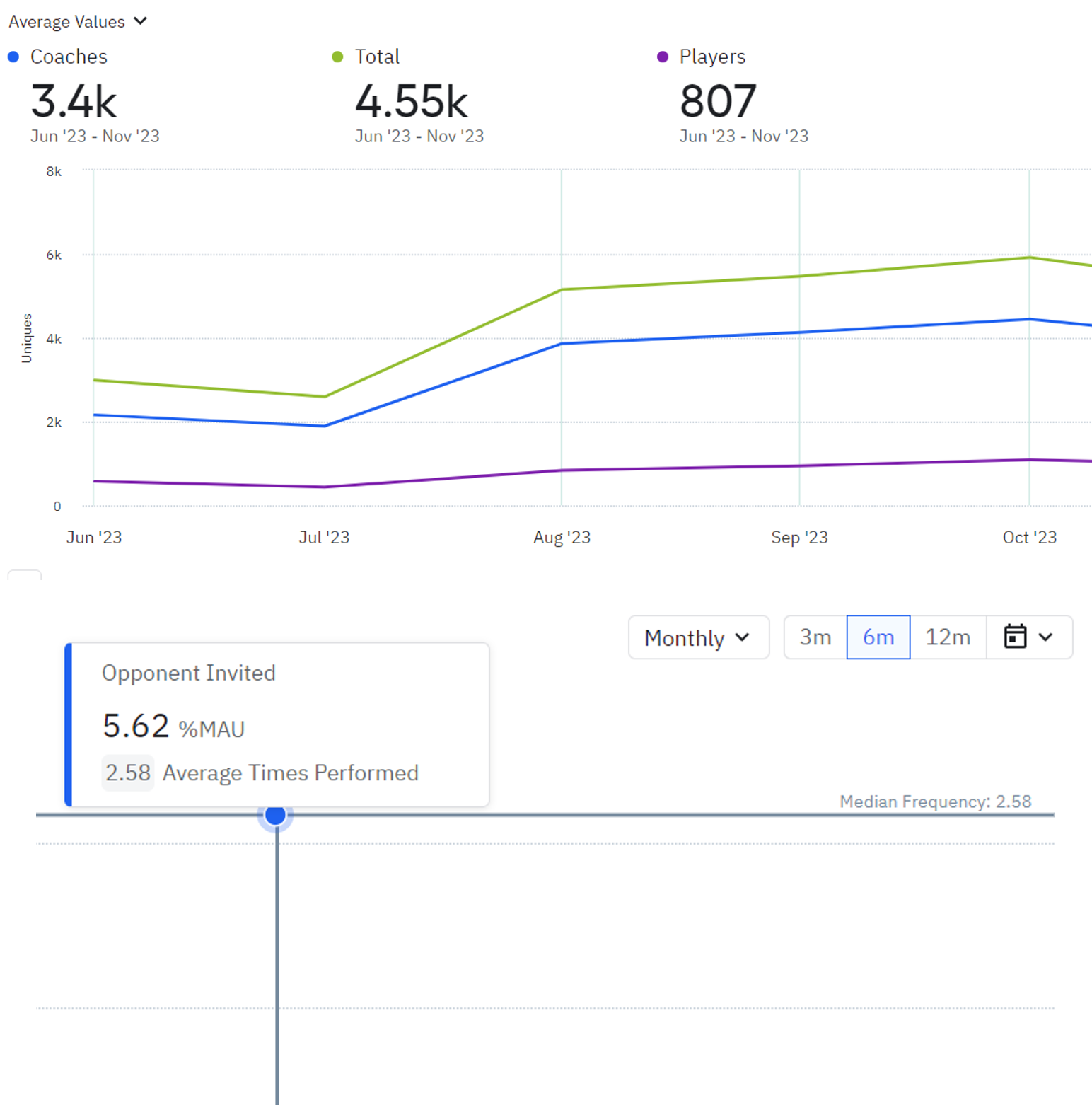 4.5k users used the feature each month, and new users signed up for a demo account. The average usage was 2.5 times monthly, indicating retention ones adopted, and 75% of people sharing are the primary user group, coaches.